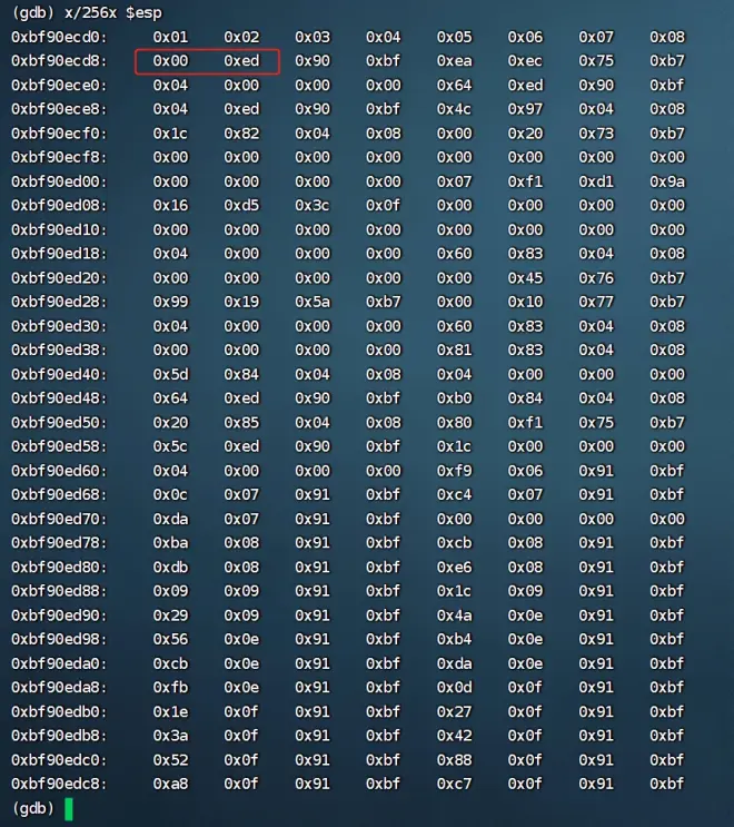 ---注意,这里要使用x/256b $esp(使用x的话显示的是有符号数的存储,数字在内存中是以补码的形式存在,无符号数的补码=反码=原码)