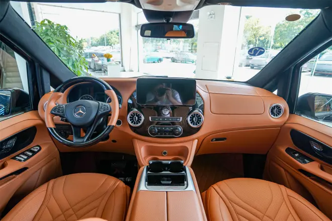 变化最大的还是要看内饰。驾驶舱一袭迈巴赫S级棕色,搭配全车真皮包覆,中间超大扶手还带车载冰箱,整体看上去很有质感而且高档。真皮包覆的正副驾驶座椅,也升级真皮包覆,通风加热功能都有,周末旅游,自己开车也很轻松。