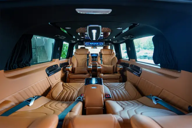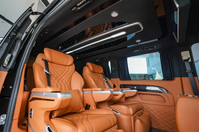 内饰方面,全车做了深度的真皮包覆,顶部是巴赫顶灯,带星空灯饰,氛围超级好。配上新款编织地毯,当流水灯亮起,仪式感满满。