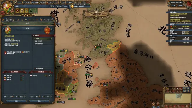 注意到爱尔兰小国对我们的侵略扩张影响较为严重,且在战争结束后英格兰一定不会在包围网战争中与我们并肩作战,因此在战争结束前尽可能地与勃艮第、卡斯蒂利亚等将英格兰视为宿敌的大国改善关系,待战争结束后立刻与之结盟以防陷入包围网战争。