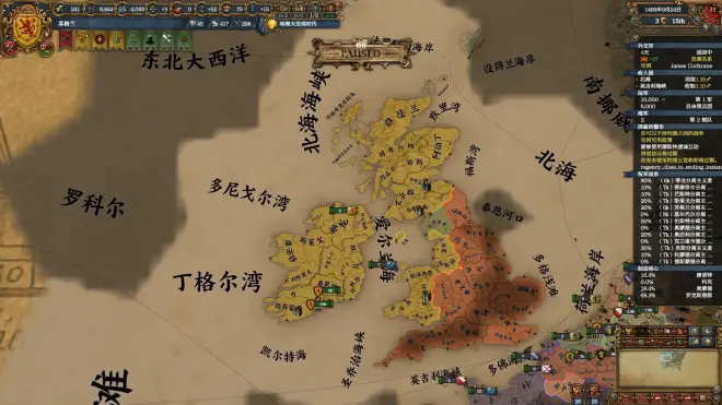 这边丹麦先行结盟了其它国家,不太愿意支持我们独立。且苏格兰开局拥有我们全部省份的核心,即吞并期限结束后其会立即吞并我们,因此在此放弃寻求丹麦的支持独立,待陆军招募至两倍上限后(附庸国陆军上限-50%)便可向苏格兰挑起独立战争。