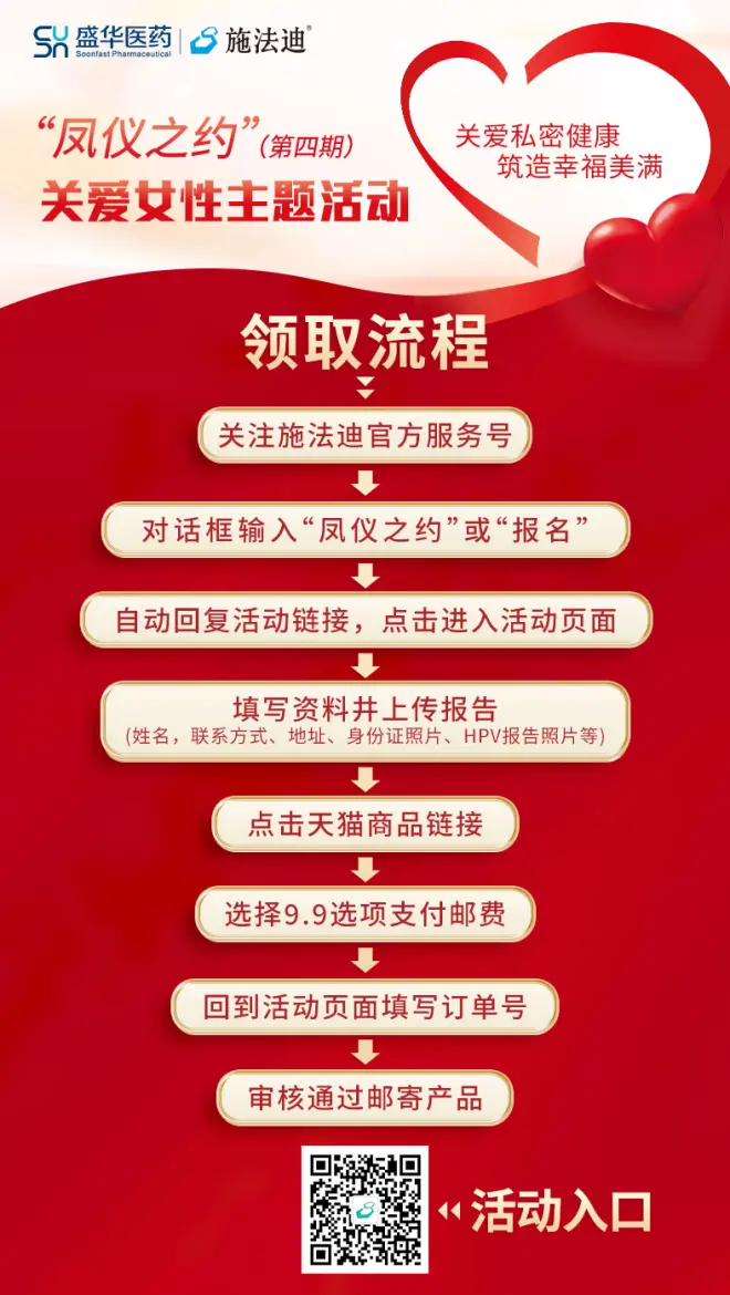 可在施法迪官方服务号、天猫施法迪官方旗舰店、快手施法迪官方号报名参与活动,后提交相应资料进行审核,(姓名、身份证号码、HPV报告三者需关联,如姓名要与身份证姓名、HPV报告姓名一致,HPV报告时间为半年内的检查报告,且HPV报告结果为阳性)。审核通过后支付9.9运费即可获得24支施法迪抗菌凝胶(消杀型)