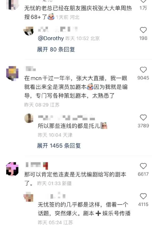 至于直播间的这些奇葩连麦,其实都是公司找的托,根本没什么爱豆与粉丝的恋情,目的就是为了炒红张大大,有了人气,自然不怕赚不到钱。