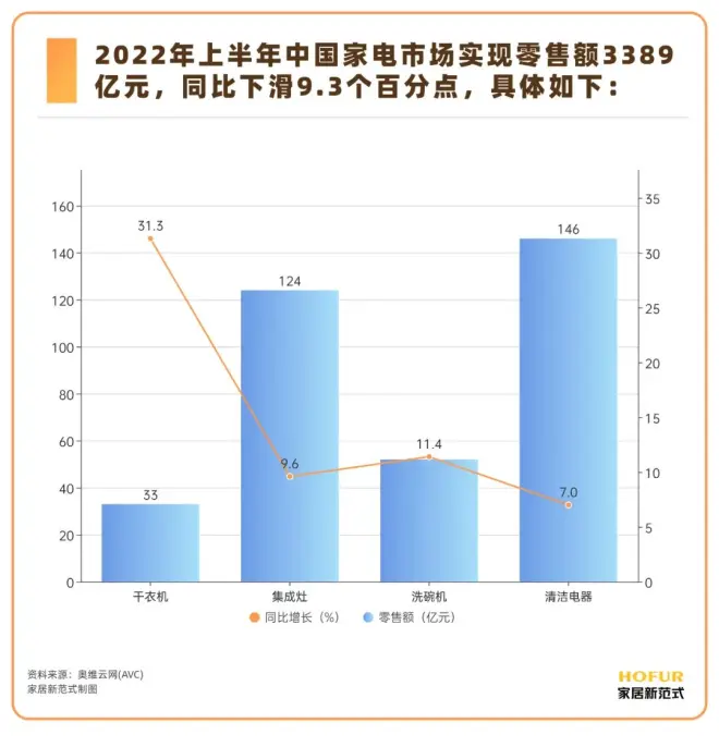 当前,新兴家电品类的表现好于整体家电,洗碗机、干衣机、集成灶、清洁电器依然保持增长趋势,且高端化、集成化、场景化、智能化趋势明显。据奥维云网(AVC)推总数据显示,2022年上半年中国家电市场实现零售额3389亿元,同比下滑9.3个百分点,新兴家电品类干衣机零售额规模达到33亿元,同比增长31.3%;集成灶零售额124亿元,同比增长9.6%;洗碗机零售额52亿元,同比增长11.4%,清洁电器销额146亿元,同比增长7.0%。