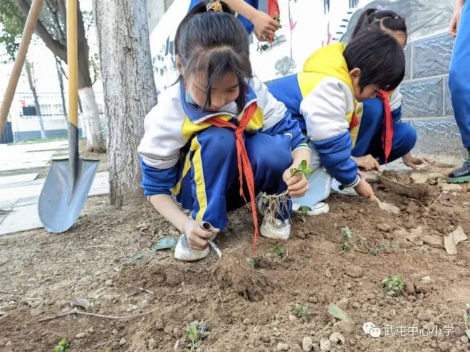 学校巧妙利用校内空地资源,作为班级种植区,让劳动教育渠道变宽。三年级地方课,老师组织学生们来到种植区种植银丹草。女生手拿小铲、男生挥动铁锨,大家相互协作,共同体验种植的乐趣。