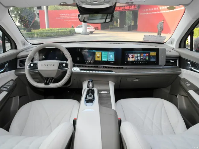 内饰方面,新车方向盘采用双色的配色,按键相对简易。新车与飞凡R7一样,采用了3+1的RISING MAX巨幕43英寸三联屏,其搭载了RISING OS智舱交互系统,并配备高通骁龙8155芯片。