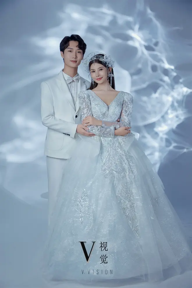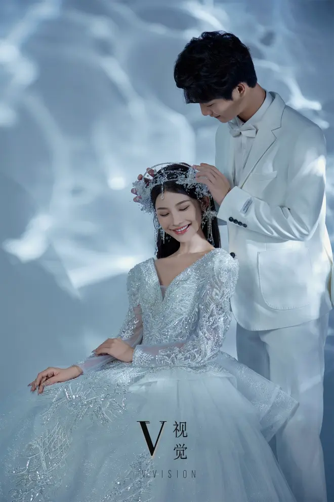原创-马卡龙色系冰蓝婚纱冰雪公主光影
