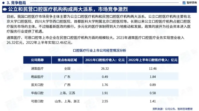 通策医疗、可恩口腔等上市企业在民营口腔医疗机构方面的规模较大。2021年通策医疗口腔医疗业务实现营业收入26.32亿元,2022年上半年实现12.46亿元。
