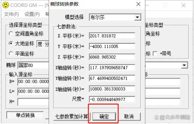 点击计算后,我们的七参数就计算出来了,然后点击【确定】就可以应用到我们接下来的坐标转换中了。