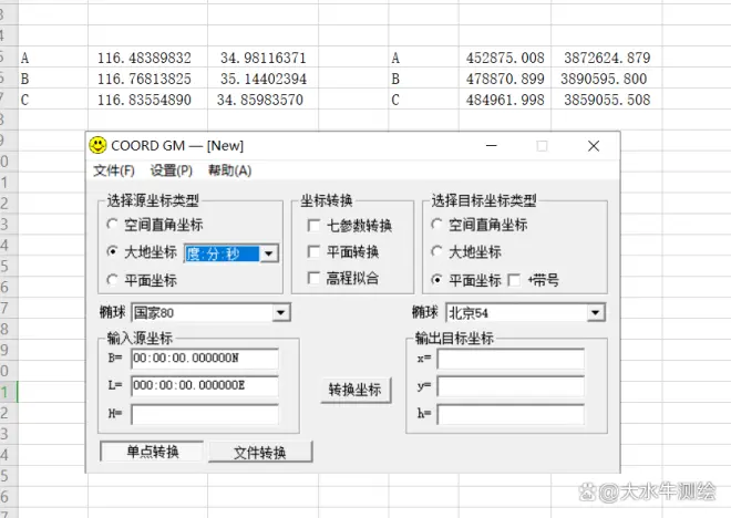 这里我们要注意一下,上图中,蓝色方框框选住的是经纬度与平面坐标的选项,我们的源坐标为经纬度坐标,所以勾选【BLH】;目标坐标为平面坐标,所以勾选【XYH】。