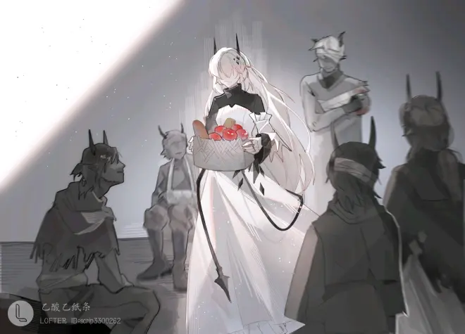 来者是一位粉发的萨卡兹姑娘,她穿着纯白的长裙,源石结晶在她的额前、腹上都肆意的汲取她美丽的生命。
