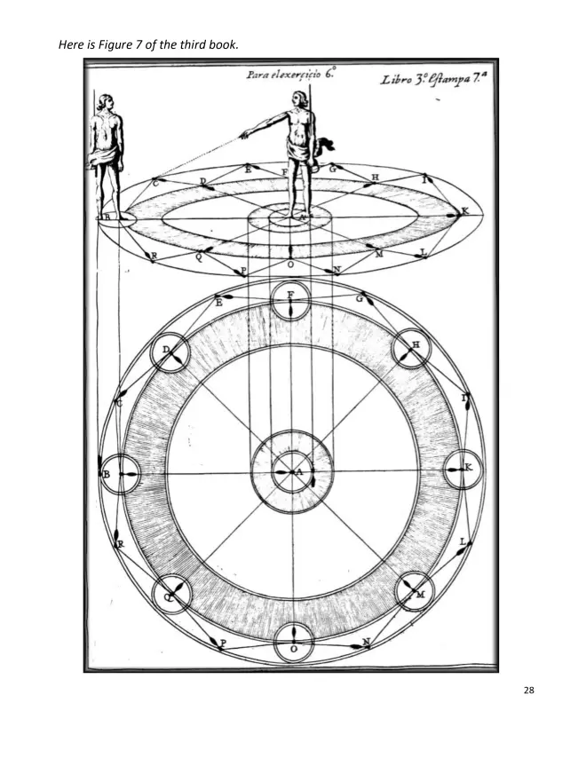 所提供的图表的目的是,学生占据内圈的半径,右脚尖始终对着对手,左脚占据两个圆周之间的横线,如字母和脚的符号所示,并在他的左侧继续他的步骤、 注意不要把他的右垂直面暴露给对手,(相反)要与对手的右侧平面相对,这是完美的直角位置,位于右垂直面的两个直径和胸部的直径之间,你可以很容易地从这个位置移动到任何一个直径,这是通过在图中提供的步骤实现的。