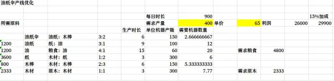 接下来我们计算各个组分的原料部分,1个绿瓶是布:初级工具=3:2,即需要布1620/天,初级工具1080/天。而布的生产速度是6s,日产能为150/天,即需要1620/150=10.8台机器产布。初级工具的生产速度是10s,日产能90/天,既需要1080/90=12台机器产初级工具。以此类推就可以完成如下的表格,并计算出满足这一产线需求的原材料数量。