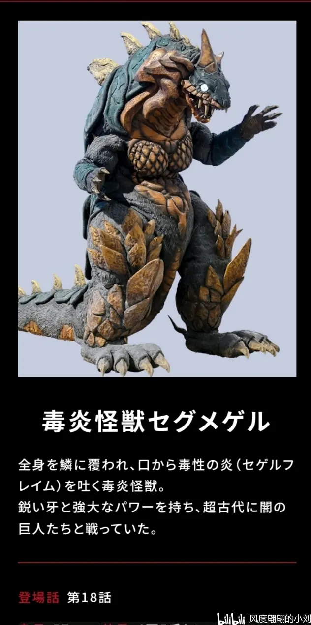 身高:57米 体重:45000吨 全身被鳞片覆盖,从口中吐出毒性火焰的毒炎怪兽。 拥有锋利的牙齿和强大的力量,在超古代与黑暗巨人们战斗过。