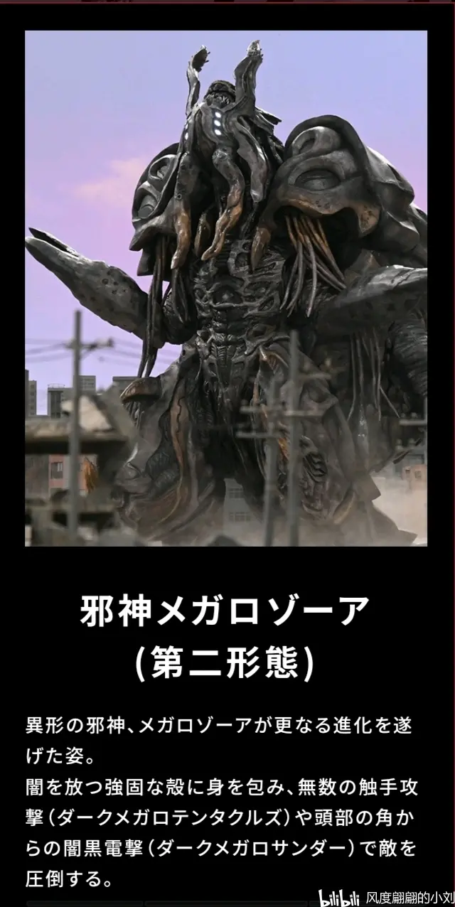 异形的邪神,梅加洛杰厄完成了更近一步的进化的身姿。 被黑暗的坚固外壳包裹,用无数的触手攻击和头部的角放出的黑暗电击压倒敌人。 随着邪神的出现,世界各地都确认了能源外流,怪兽的出现也被认为是避难活动。 由于黑暗的侵蚀和核心的暴走,推测地球存续的危机正在逼近,再加上梅加洛杰厄在黑暗龙卷风中进化成第二形态。 特利迦奥特曼和精英胜利队展开了和黑暗特利迦的共同战线,全力迎击梅加洛杰厄,最终被真理特利迦击败。 凶暴宇宙鲛盖内伽古