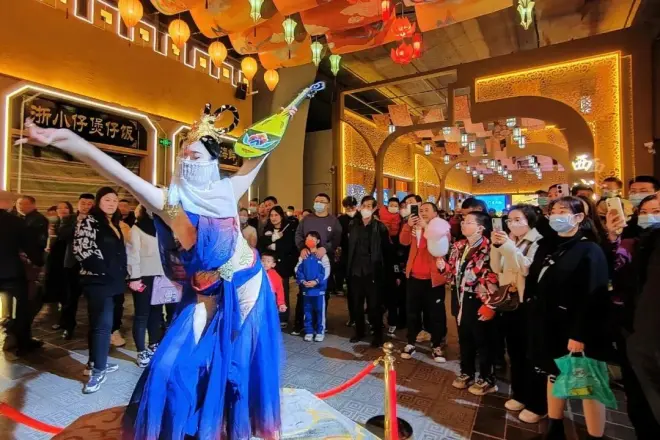 在“丫”字形街区的交汇处,就是黄河食渡文化夜市的主舞台“兰州眼”,舞台将声、光、电充分融合,每天排演不同的节目,既有古风的舞蹈表演,也有国潮的音乐鉴赏。