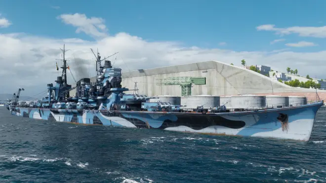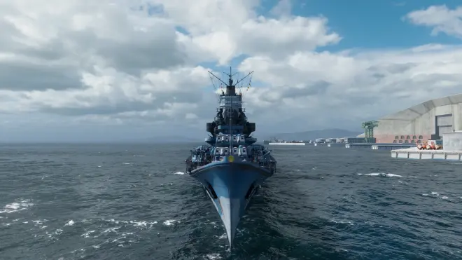 右舷侧面视角,藏王是一艘基于丸六计划甲级巡洋舰(即重型巡洋舰)计划设计而成的重型巡洋舰,实际上并没有明确的图纸提供,具体细节来源自日本某杂志介绍该计划的专题中有所提及。藏王的吨位在轻巡中实在是太过于轻了,甚至在后续推出的日本轻巡科技树的淀都拥有比藏王更加沉重的吨位,加上比较薄弱的装甲结构,这艘战舰世界中堪称元老级别的重巡也时常被戏称为驱逐舰。