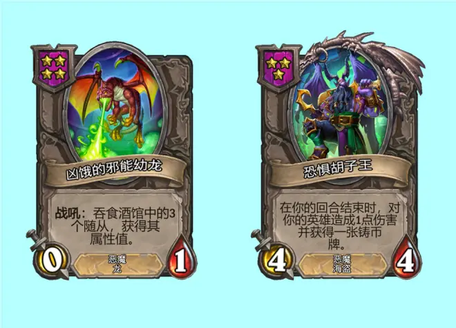 在这次双种族新卡里,恶魔获得了三次与其他种族组合的机会,和龙组合的邪能幼龙是不错的中期打工人,尤其是场上有监工的情况下,可惜邪能元素退环境了,而他在女巴手里还可以每回合稳定成长。恐惧胡子王有点像后台保安+海上走私贩的合体,在恶魔阵容里有回溯血的手段还是能拿来打打工的,在海盗阵容里就算了,海上走私贩比他要好用。