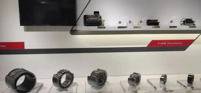展厅内摆放了NSK品牌从大型到微型、从通用到专用等各种型号、各种类型的轴承产品,展示了众多应用场景。