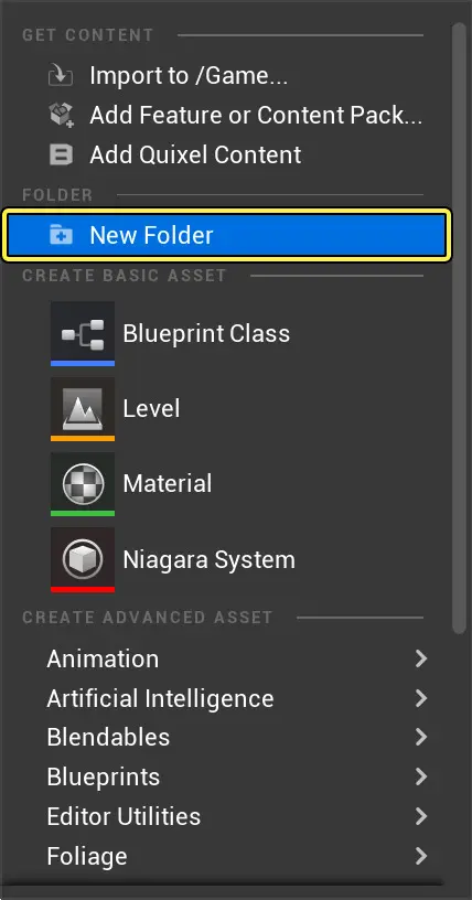 3.选择 新建文件夹(New Folder) 以在 "/Game" 中创建一个新文件夹。