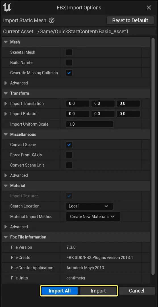 4.编辑器中将显示 FBX导入选项(FBX Import Options) 对话框。单击 导入(Import)或 全部导入(Import All) 会将你的网格体添加到项目。