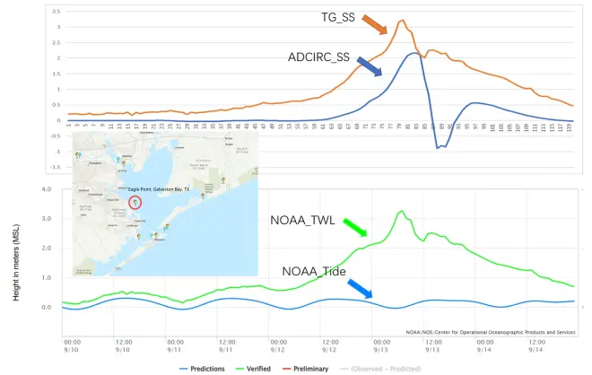 由于在Ike登陆的核心区域内绝大部分验潮站都出现了数据间断,因此采用唯一完整记录了整个过程的验潮站进行定性方面的粗略对比: