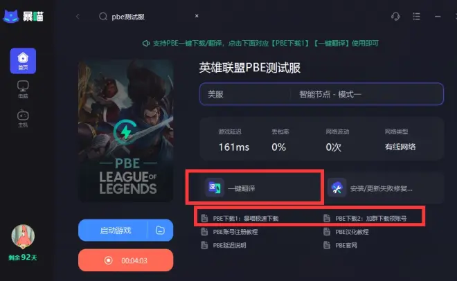 1,同样的在暴喵客户端搜索pbe测试服进行加速完成,然后点击pbe官网进入