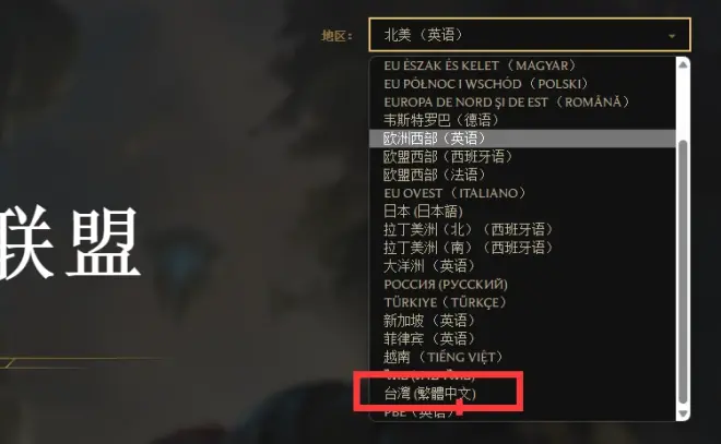 2,进入游戏官网,点击右上角,将游戏区服修改为台服(lol国际服的游戏区服,由账号所属区服决定)