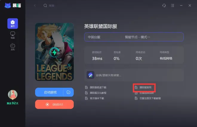 1,下载并打开暴喵加速,在加速客户端搜索英雄联盟国际服,选择台服或者港服进行加速完成,在点击国际服官网进入