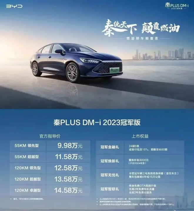 比亚迪秦PLUS DM-i 2023款冠军版刚刚上市没几天,日产轩逸和吉利帝豪都慌了,立马降价。