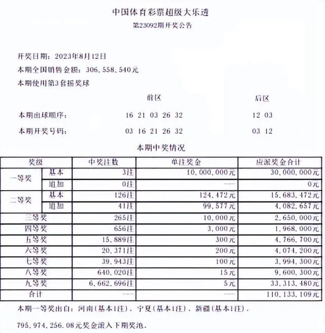 8月12日,体彩超级大乐透第23092期前区开出号码“03、16、21、26、32”,后区开出号码“03、12”。本期全国销售额达3.06亿元,为国家筹集彩票公益金1.10亿元。