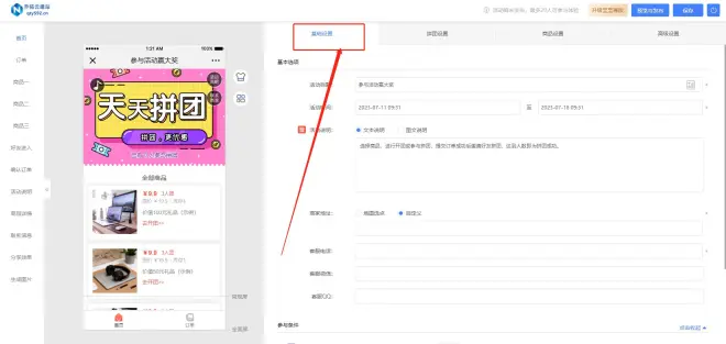 除了修改内容,你还可以在基础设置中修改活动标题、时间、说明、参与人数等信息。这些信息将直接显示在小程序的首页和拼团详情页中,让用户更清楚地了解活动的信息。