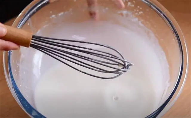 1.先准备270g牛奶,30g气味比较小的食用油,60g白砂糖,用筷子搅拌均匀,液体的材料搅匀之后,我们加105g的水磨糯米粉,再放45g小麦淀粉增加透亮度,最后搅拌好的状态就是这种细腻顺滑又没有颗粒的糊状。