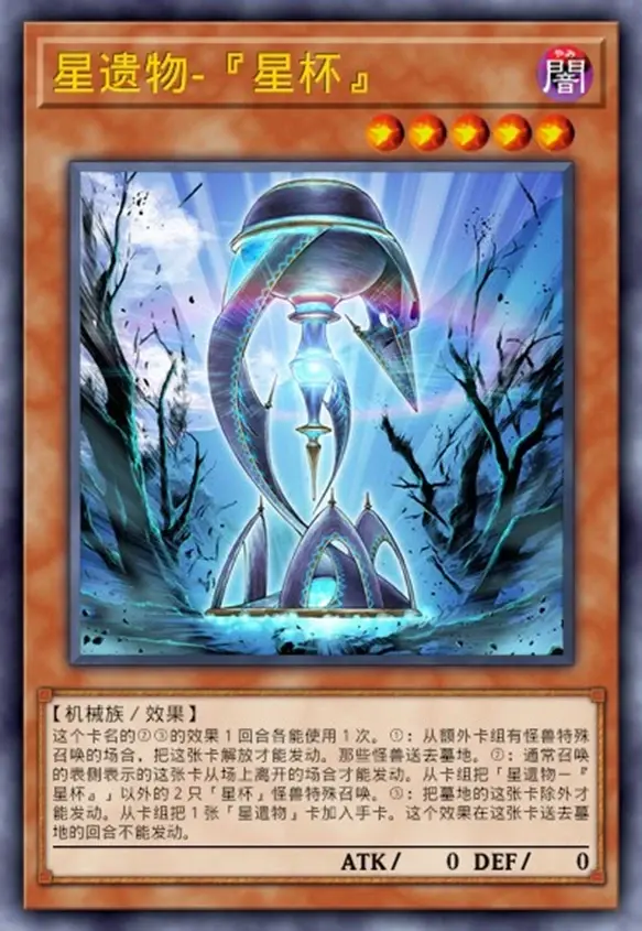 展开的核心点,通召离场从牌组拉两只星杯怪兽,在这套构组里,通常选择拉怪让自己场上/手牌/墓地 集齐 凡骨(水),妖精(光)和星杯龙(风),为后续展开和精灵圣母登场做准备。