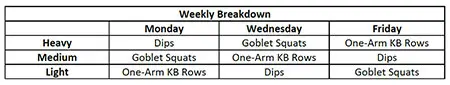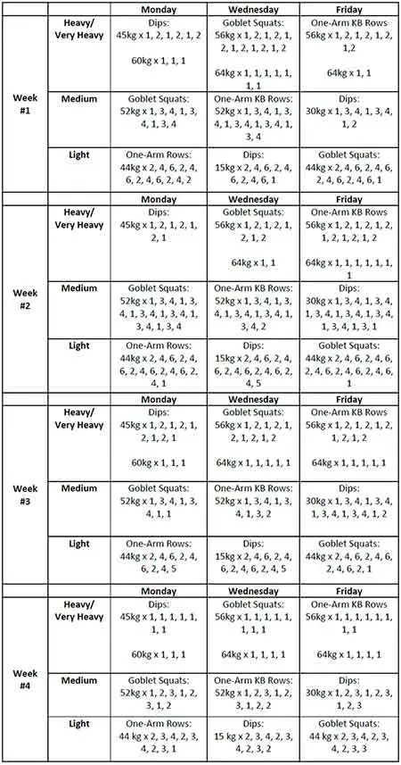 BTS 3每周进行三次(周一、周三和周五),侧重于肌肉肥大。每天包括重、中、轻量级的训练,每个训练项目属于这些类别之一。这些训练的强度在整个周内有意地轮换,因此同一项训练在下周之前不会重复相同的强度。为了尽可能简单,我选择了简单的方法,只使用主要的练习,没有专门的变化。当然,还包括单臂摆荡和土耳其起立动作,以进行特定的Sinister训练。