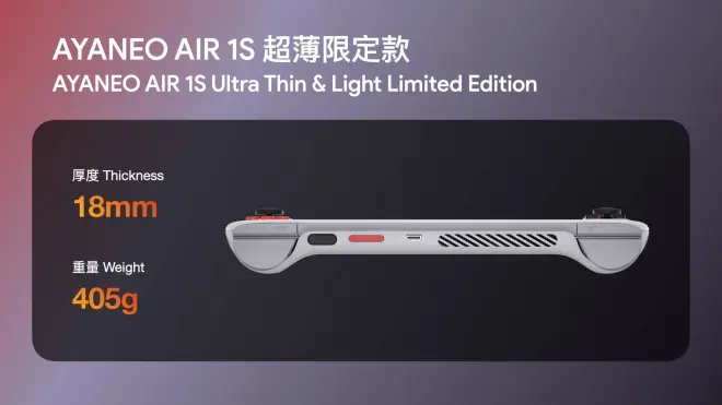 更极致轻薄的 AYANEO AIR 1S 超薄限定款的机身厚度仅为 18mm,重量为更轻的 405g,这对于 Windows 掌机来说绝非易事,AYANEO 强大的研发能力再次展现得淋漓尽致。