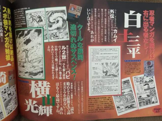 荒木飞吕彦不仅受到西方绘画的刺激,其所处的日本社会也是他最大的养成之所,此处要简略谈一谈日本漫画史上「剧画」(げきが)的影响。荒木曾多次提及喜爱的漫画家楳图一雄(楳図かずお)、梶原一骑、白土三平、以及横山光辉等大家,他们的作品对荒木的漫画创作提供了丰富的养分;后三者还被荒木选入《JOJOAGO!GO!》别册中的三大漫画家。(31)这几位漫画家都是「剧画」的代表人物,「剧画」风潮兴起于1950年代中叶,某种程度上是对于手冢治虫的反动;「剧」之一词有着戏剧、剧烈之意,相对于大众文化流行的轻松、搞笑的漫画风格,剧画追求更强烈的真实性与严肃的表现方法。(32)