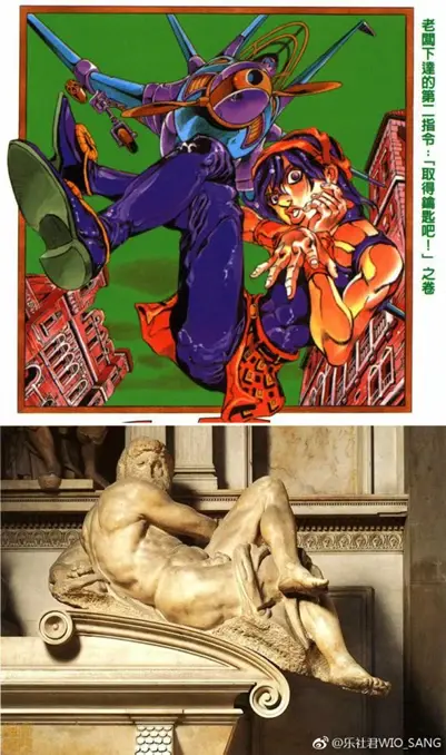 米开朗基罗创作生涯中期的作品,《梅第奇墓》作品是由两组雕像而成,棺木上斜躺的人像分别为「日」、「夜」、「晨」、「昏」,米开朗基罗所表现的这四座人体裸像透过肢体的伸展,突显了人体肌肉的线条以及厚重感。其中这一座象征白天的《日》,以强烈扭转的结构呈现生命晨起的动势。《JoJo》第51集封面由纳兰迦摆出了这个姿态。