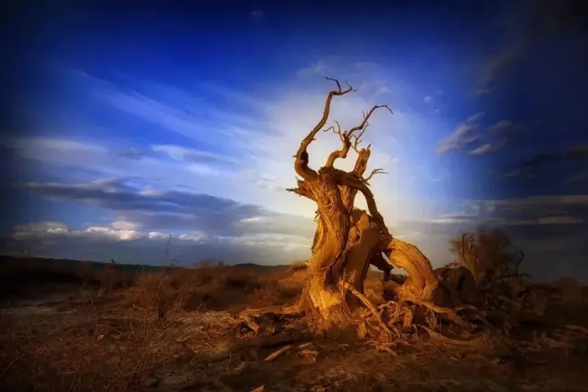 铁血胡杨以其顽强意志抵挡沙漠侵蚀,铁骨铮铮的树干形状千姿百态,似鲲鹏展翅,又似骏马扬蹄,更似铿锵玫瑰;磅礴向上的姿态诠释不屈不挠的精神,鬼斧神工的形态体现生命的律动;胡杨林之壮美可见一斑,“矮如龙蛇数变形,蹲如熊虎踞高岗。嬉如神狐九尾,狞如夜叉牙爪张”,蓬勃的生命力喷涌而出,天然的艺术宫殿拔地而起。