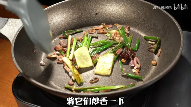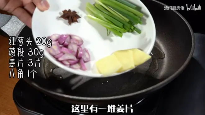 准备姜片3片、红葱头20克、葱段30克、八角一个,少油下锅,炒香(按地区口味可以加冬菇瑶柱等)