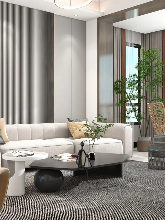 客厅中现代高级质感的呈现,以灰色面板与格栅拼接组合的沙发背景墙为依托,加入精致的曲线吊灯装饰,同色系条纹地毯呼应整体风格,在细节的处理中,绿植的辉映则营造自然温馨的生活气氛。