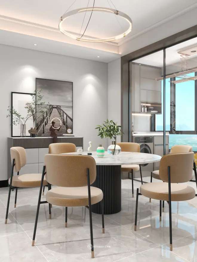 餐厅圆桌与上方圆形吊灯相衬,大地色的餐椅简约雅致,搭配绿色植株与深色系餐边柜,空间视野开阔、更显精致端庄,而当莹莹灯光洒落时,一室温暖由此氤氲,让用餐时分也满是仪式感。