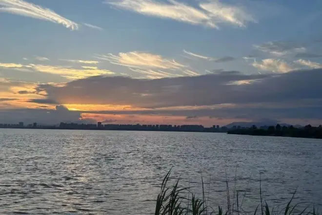初秋的傍晚,踱步在安庆市迎江区新洲乡南江岸上,微风轻拂,芦苇摇曳;晚霞翩翩,与水共舞;落日余晖,静谧迷人。