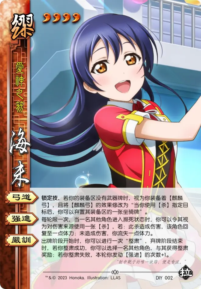 真的很会玩手杀那一套。同仇可以勉强认为对抗“我们仨”偶像团,并进理解为共同进步,勠力理解为共同努力,疏财就说不太通了,毕竟偶像活动需要花费,真姬疏财也是只给缪斯。这个机制给张飞鲁肃挺合适,给小鸟就算不上完美了,我觉得这个机制很难拿来做文章。