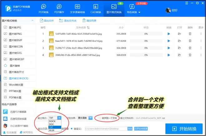 第二步 需要的图片文件都导入后就可以在下方设置输出的格式和识别效果了,合并到一个文件查看整理更加方便。
