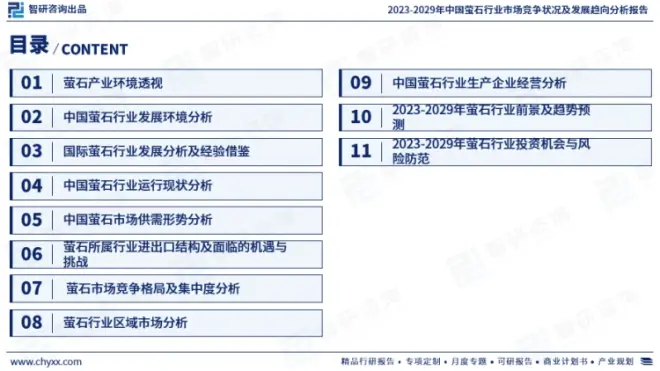 《2023-2029年中国萤石行业市场竞争状况及发展趋向分析报告》是智研咨询重要成果,是智研咨询引领行业变革、寄情行业、践行使命的有力体现,更是萤石领域从业者把脉行业不可或缺的重要工具。智研咨询已经形成一套完整、立体的智库体系,多年来服务政府、企业、金融机构等,提供科技、咨询、教育、生态、资本等服务。