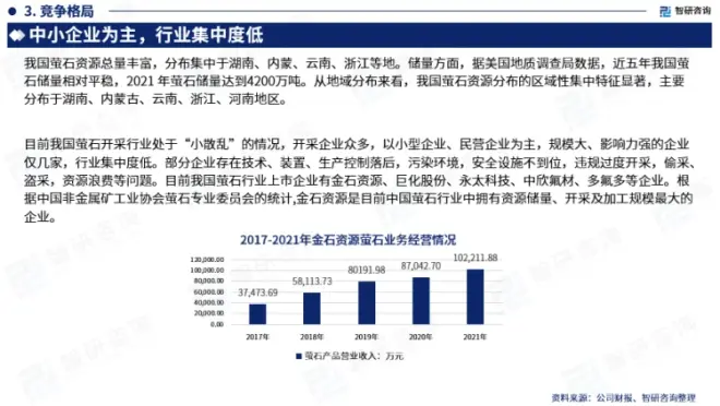 目前我国萤石开采行业处于“小散乱”的情况,开采企业众多,以小型企业、民营企业为主,规模大、影响力强的企业仅几家,行业集中度低。部分企业存在技术、装置、生产控制落后,污染环境,安全设施不到位,违规过度开采,偷采、盗采,资源浪费等问题。目前我国萤石行业上市企业有金石资源、巨化股份、永太科技、中欣氟材、多氟多等企业。根据中国非金属矿工业协会萤石专业委员会的统计,金石资源是目前中国萤石行业中拥有资源储量、开采及加工规模最大的企业。