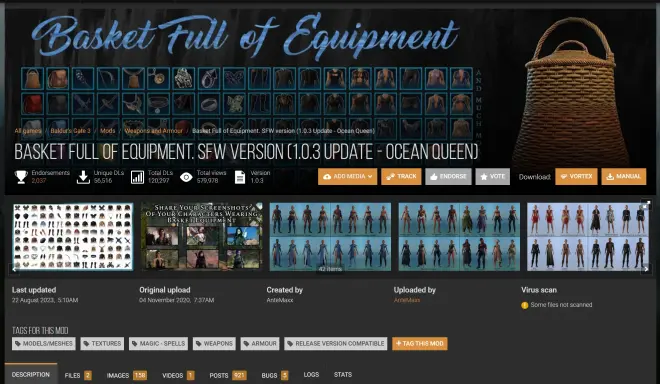 这个mod可以用Tutorial Chest Summoning召唤,也能在游戏里找到,第一个地方是你醒来时,走上楼alt一下,能看到图片里这个篮子,里面就是这mod的超多服装;另一个地方在招募阿斯代伦的海滩边上,在水边有个小码头(好像是),码头边上就有这个篮子。