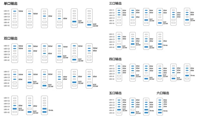 多个接口同时使用的功率分配问题,先看单个接口的功率情况,主要分为三档,100W/65W/22.5W。