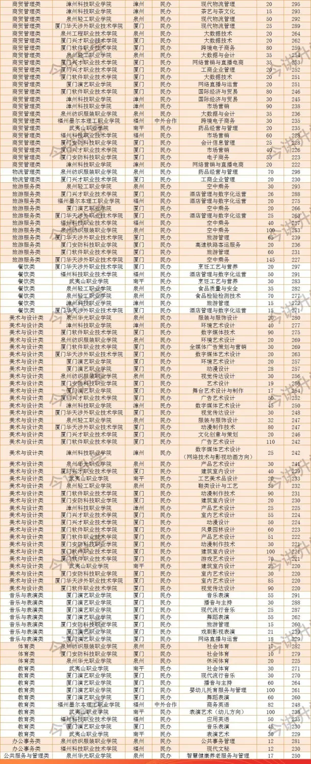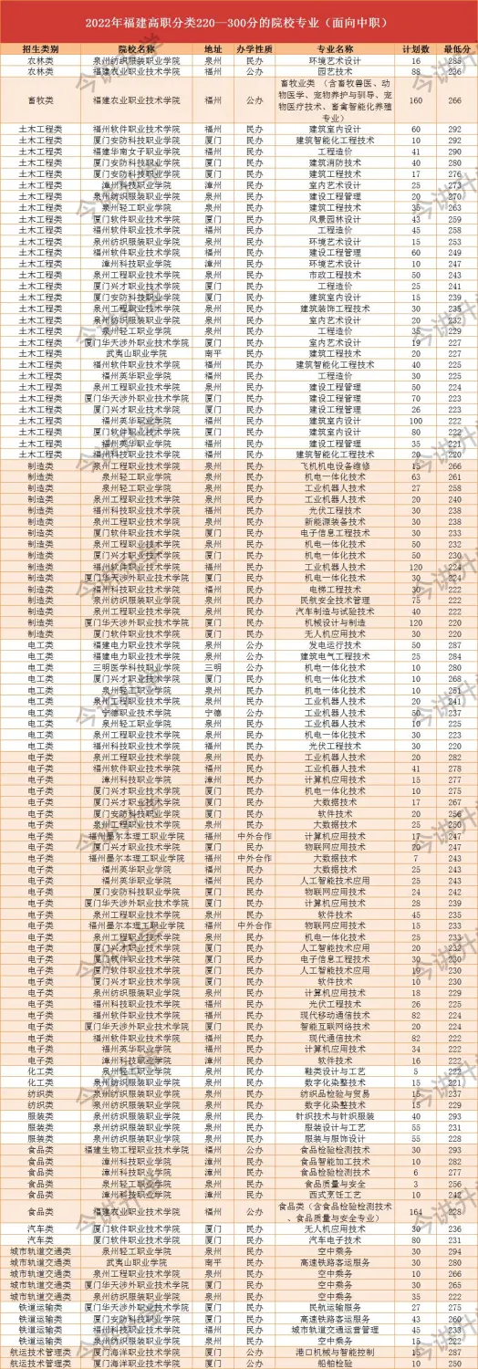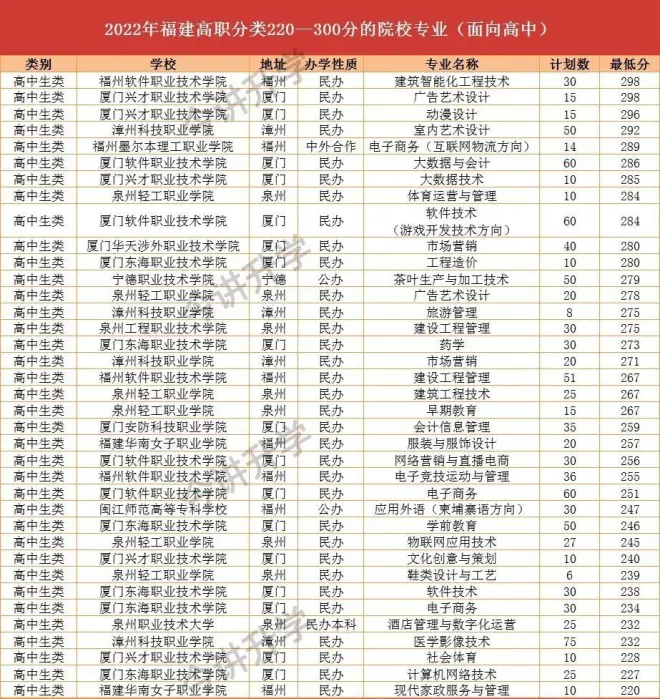 今天的内容是:福建高职分类招考220~300分能报的院校和专业汇总。